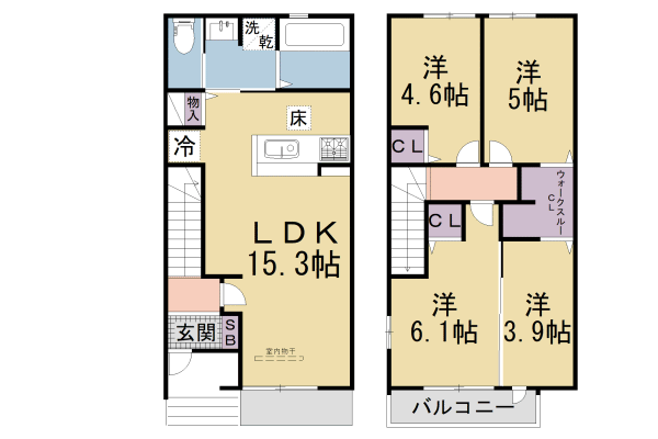 | 間取り詳細 | 洋6.1 洋5 洋4.6 洋3.9 LDK15.3 | 構造 | 軽量鉄骨 |